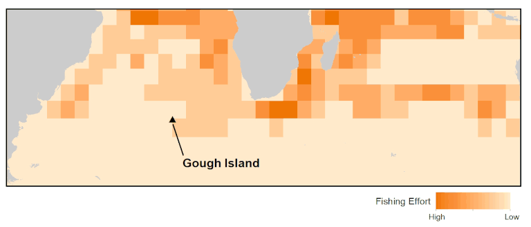Tristan Albatross from Gough Island, South Atlantic. Non-breeding adults and juveniles disperse more widely than breeding adults and have higher overlap with longline fishing effort, which may mean increased risk from bycatch. Source: Carneiro et al. (2020). Thanks to our data contributors.