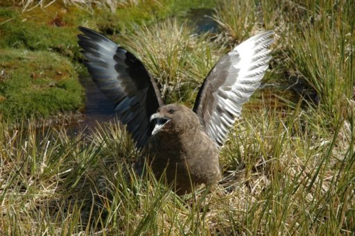 The seven species of Skuas (genus Stercorarius) spread across both hemispheres – all of which, except the Chilean Skua, are migratory. These large birds have an average wingspan of ~1.2m and are intelligent and notoriously aggressive.