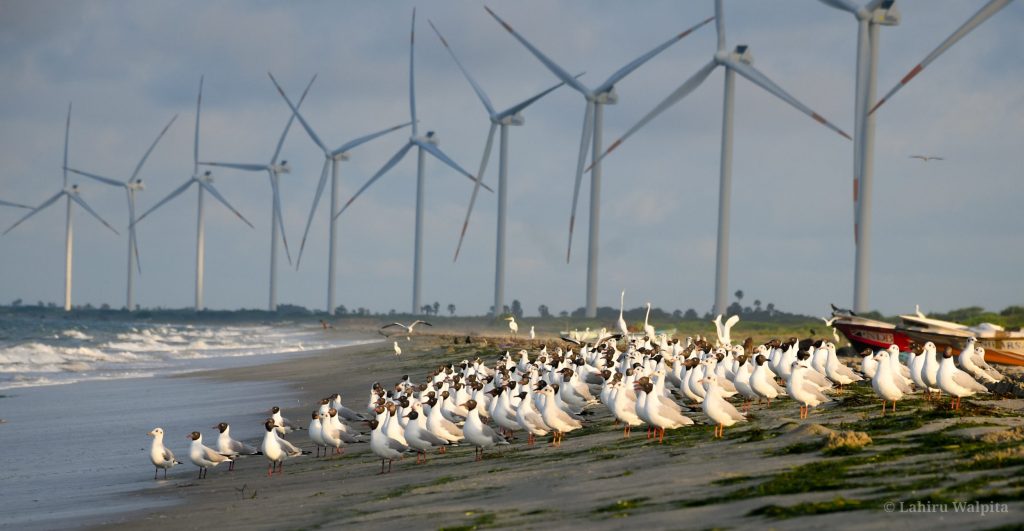 Figure 4. Hundreds of Tibetan-breeding Brown-headed Gulls, a species particularly susceptible to turbine collisions, gather along the windmill-covered southern coast of Mannar before migrating northward (Photo by Lahiru Walpita)